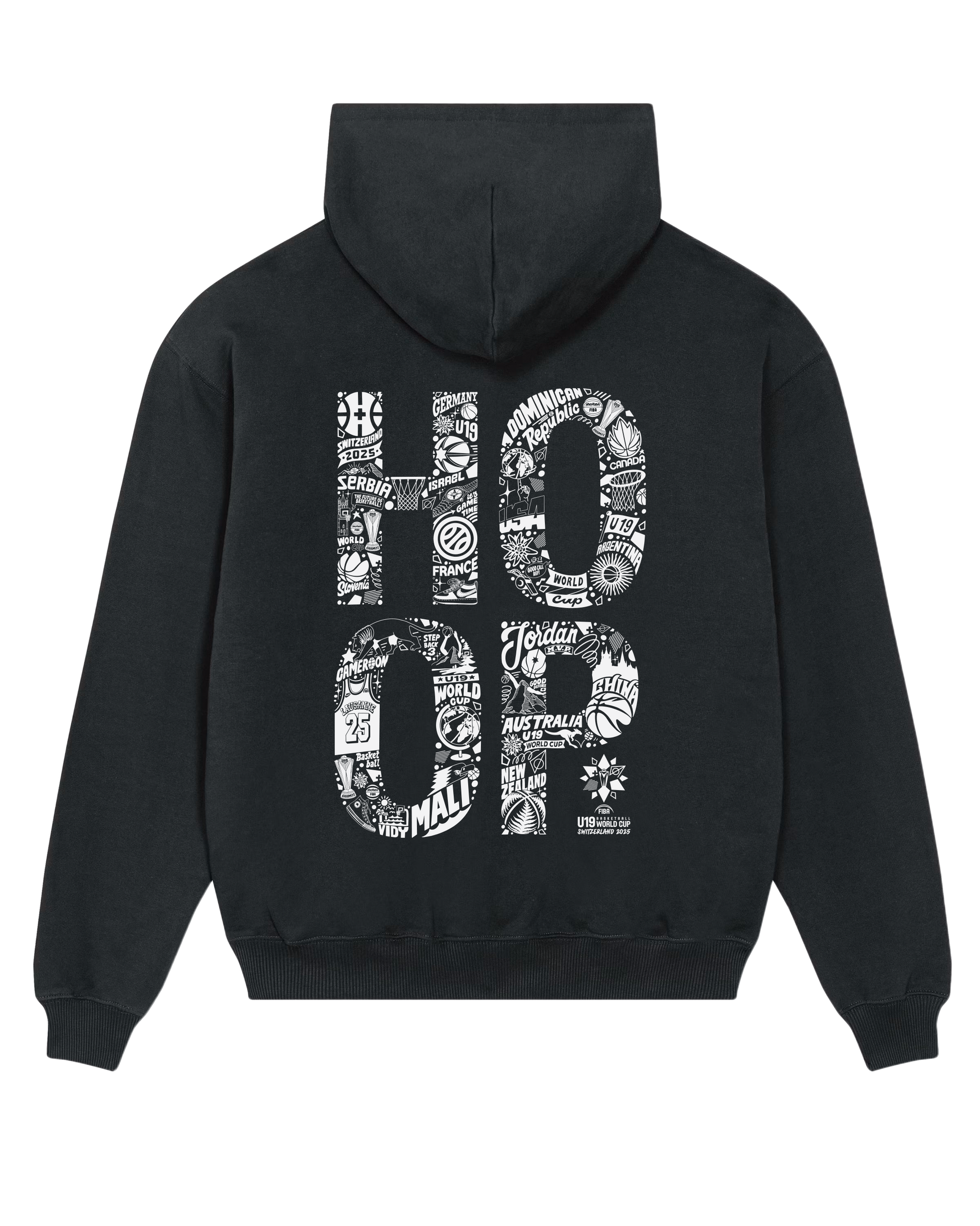 Hoodie unisexe noir à coupe boxy conçu pour les amateurs de basketball et les supporters de la Coupe du Monde U19. Sa coupe ample assure un confort optimal, tandis que sa couleur et le logo "Hoop" dans le dos apportent une identité forte. Idéal à porter en tribunes, à l’entraînement ou au quotidien.